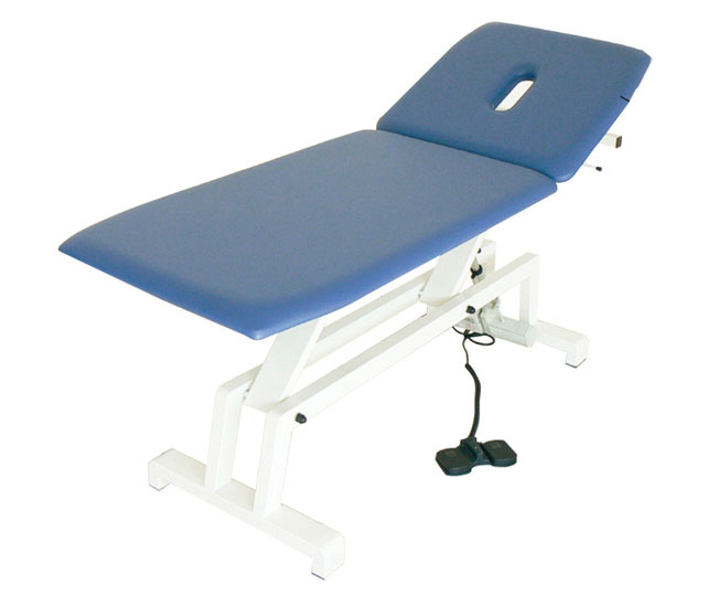 Lettino per visita medica e trattamenti, robusto ed estremamente stabile, regolabile elettricamente in altezza mediante pedale. Sezione gambe fissa e testata con foro naso e bocca regolabile manualmente.