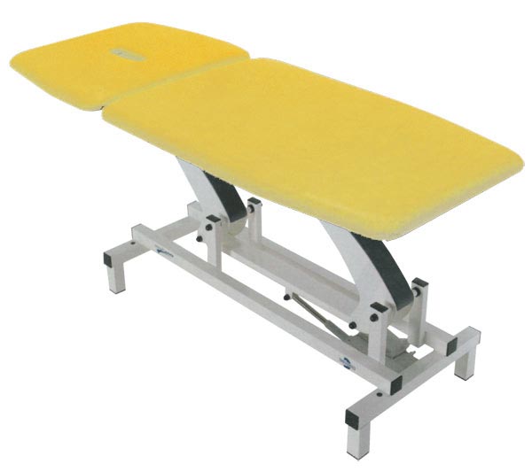 Lettino per visite e terapia ad alta stabilità. Regolazione elettrica dell’altezza mediante pedaliera (bassa tensione 24 V). Una sezione mobile, sistema di regolazione della testata (con foro naso-bocca) servoassistito da molla a gas e sezione gambe fissa. L’ampia testata può essere regolata in positivo ed in negativo.