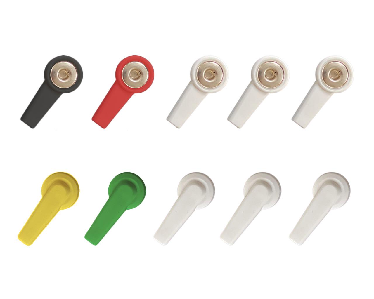 gli adattatori sono riutilizzabili con gli elettrodi a bottone monouso. Ad ogni tracciato dunque gli elettrodi vanno cambiati ma gli adattatori possono essere lasciati sugli spinotti da 4mm del cavo ECG senza doverli togliere.
