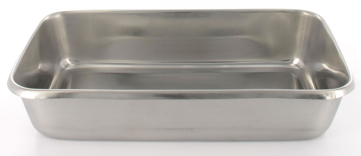Vassoio in acciaio inox con angoli rotondi, stampato senza saldature. Autoclavabile a 121°C.
