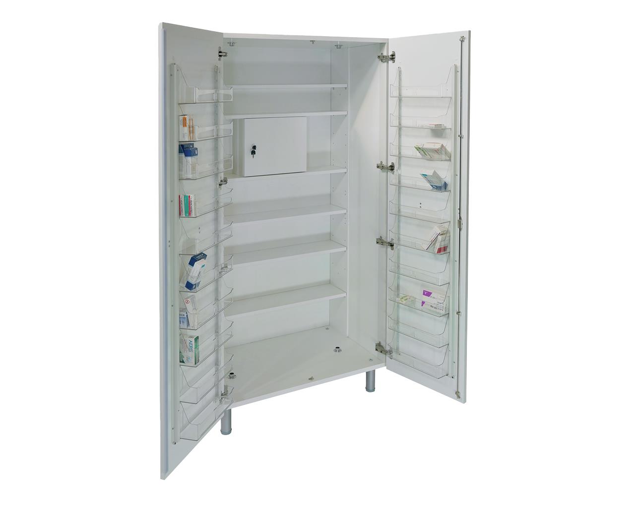 Armadio portamedicinali con struttura di alluminio verniciata a polvere con pannelli di melamina.