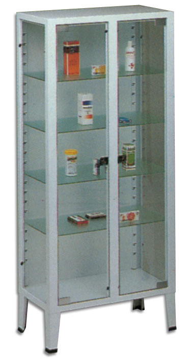 Armadio a due ante, con struttura in acciaio verniciato e vetri temperati. Fornito di 4 ripiani regolabili.