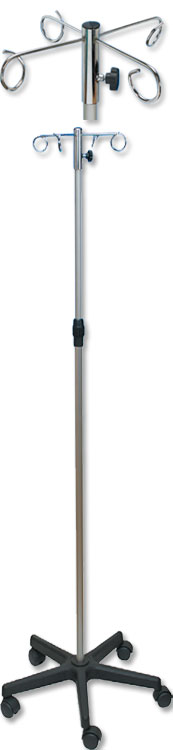Asta porta flebo in acciaio cromato a 4 ganci, su piantana a 5 rotelle.