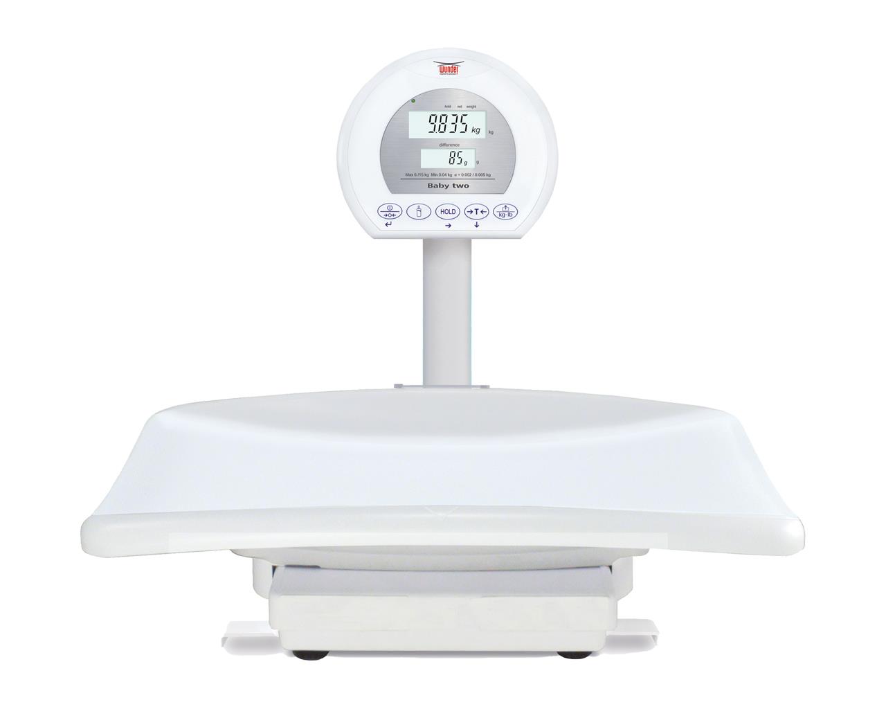 Baby02 - 1 di Wunder è una bilancia pesaneonati elettronica professionale in ABS bianco con indicatore digitale posizionato su colonna, superficie comoda e sicura grazie ai bordi ricurvi, e display doppio facilmente leggibile.