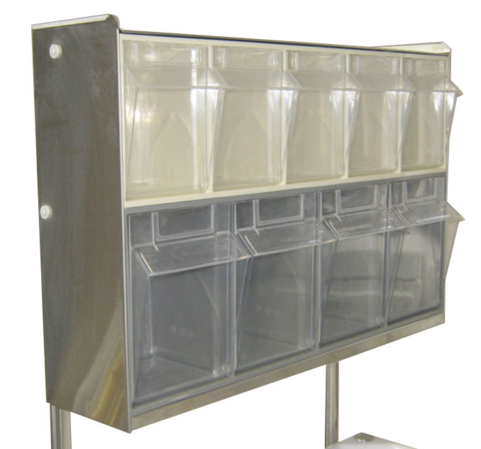 Cassetti superiori pensili (5 medi + 4 grandi) per carrelli modulari.