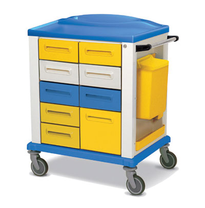 Carrello polifunzionale professionale con struttura solida, robusta con l'utilizzo di componenti in materiale plastico (tecnopolimeri) e lamiera di acciaio verniciata con polveri epossidiche per ottenere la massima leggerezza, manovrabilità e praticità d'uso.