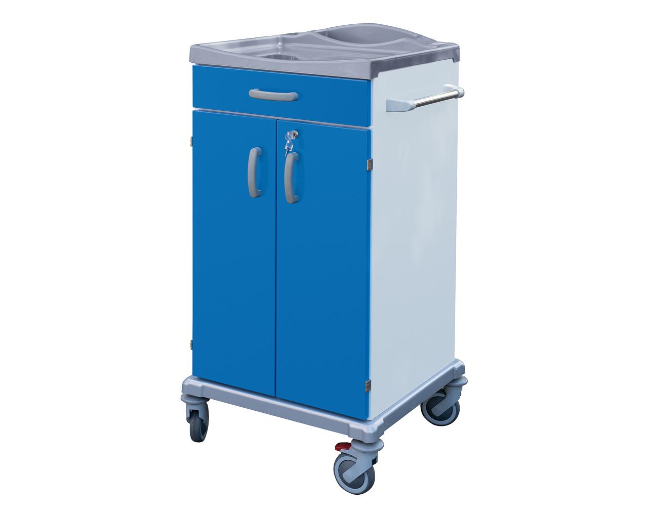 È dotato di maniglione di spinta ergonomico integrato, due ante con 2 ripiani interni e un cassetto in acciaio rivestito con polveri epossidiche antimicrobiche, chiusura con chiave e quattro rotelle piroettanti antitraccia di cui due con leva di blocco e supporto in plastica rinforzato.