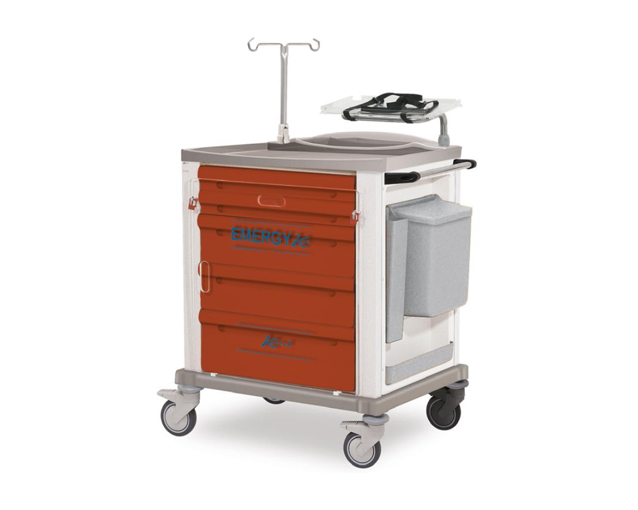 Carrello per emergenza con struttura, autoportante e monoscocca, realizzata in materiale plastico tecnopolimero verniciato a polveri epossidiche.