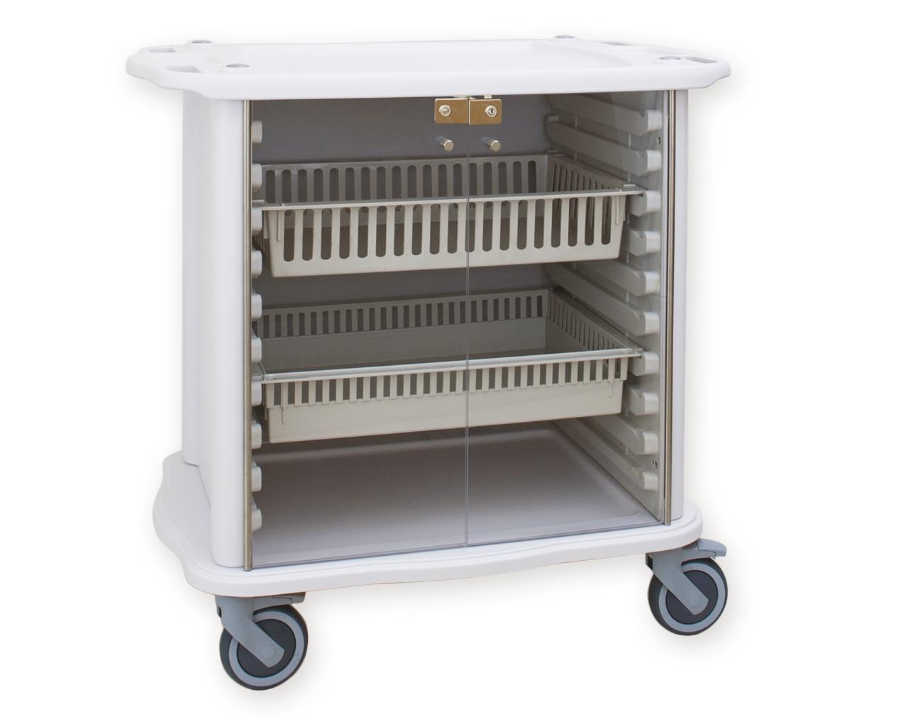 Carrello di servizio con struttura in poliuretano Baydur-Bayer AG lavabile e disinfettabile; non provoca reazione agli acidi diluiti, agli alcali e ai solventi.