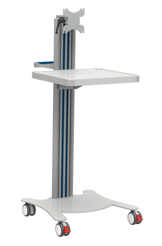Carrello multiuso Super Easy, munito di una maniglia, un ripiano e supporto monitor, componibile a piacere con numerosi accessori.