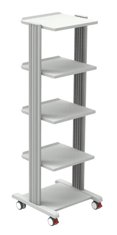 Carrello Smart di nuova generazione di colore grigio/bianco RAL 7035 con struttura in alluminio e 5 ripiani, ampi e resistenti, verniciati a polvere. I ripiani non sono estraibili.