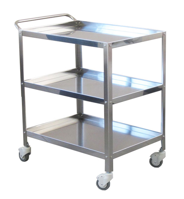 Carrello "Ter Trolley" in acciaio inox dotato di maniglia e 3 ripiani con bordi (3,5 cm) su 4 lati. Ha 4 solide ruote in gomma (Ø 80 mm). Spedito smontato.