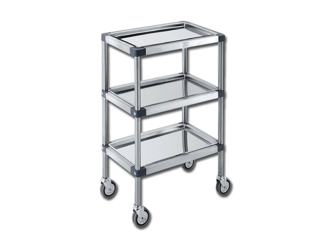 Carrello "Ter Plus" con struttura in acciaio inox montata su rotelle Ø 80 mm. Dotato di 3 vassoi removibili.