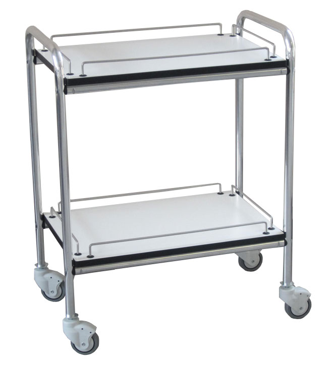 Pratico carrello con corpo e maniglie in alluminio. Il carrello "Gima 2" è dotato di due ripiani bianchi di 18 mm di spessore con bordi neri in PVC con spondine "salva-oggetti". Due grandi maniglie facilitano sia il trasporto che il sollevamento del carrello. Spedito smontato.