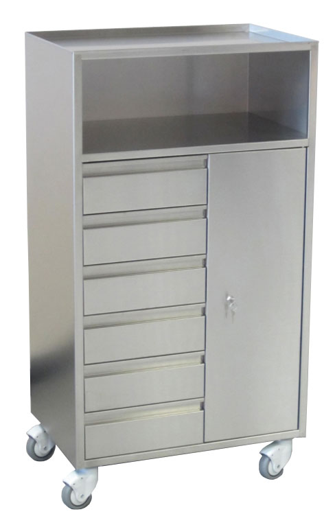 Carrello Anestesia in acciaio inox AISI 304 satinato, con 6 cassetti ed un ampio scomparto verticale.