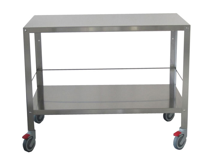 Tavolo carrellato per sala operatoria caratterizzato da una struttura tubolare in alluminio, con 2 ripiani in acciaio inox AISI 304 satinato. Ripiano inferiore con ringhierine anticaduta sui 3 lati. Completo di 4 ruote piroettanti Ø 125 mm di cui 2 frenanti.