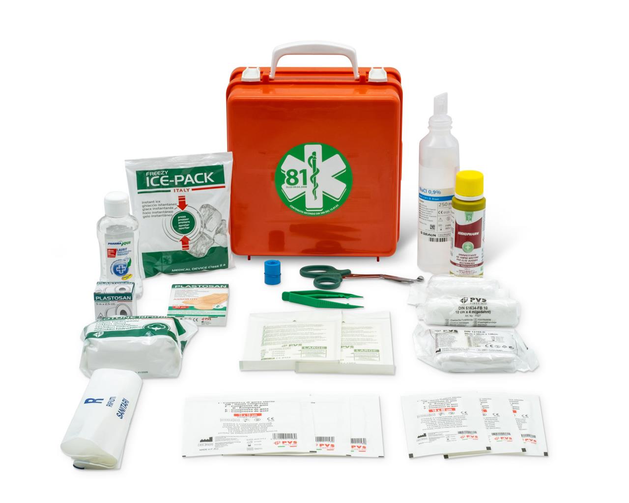Il prodotto è fornito come pacco medicazione 'maggiorato', in quanto contiene, oltre ai prodotti indicati nel decreto come contento minimo, anche altri articoli utili al primo soccorso e consentiti dal decreto stesso.