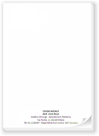 Blocco ricettari formato A4 da 50 fogli stampato in bianco e nero. Incollato in testa e con cartoncino sottoblocco in carta uso mano da 90 gr.