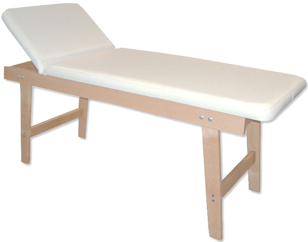 Lettino da visita con struttura in legno massello di faggio, progettato per fisioterapia, trattamenti estetici, ambulatori e centri benessere. Realizzato in Italia, offre un piano imbottito con rivestimento lavabile in skay di colore beige e schienale regolabile per adattarsi a diverse posture e trattamenti.