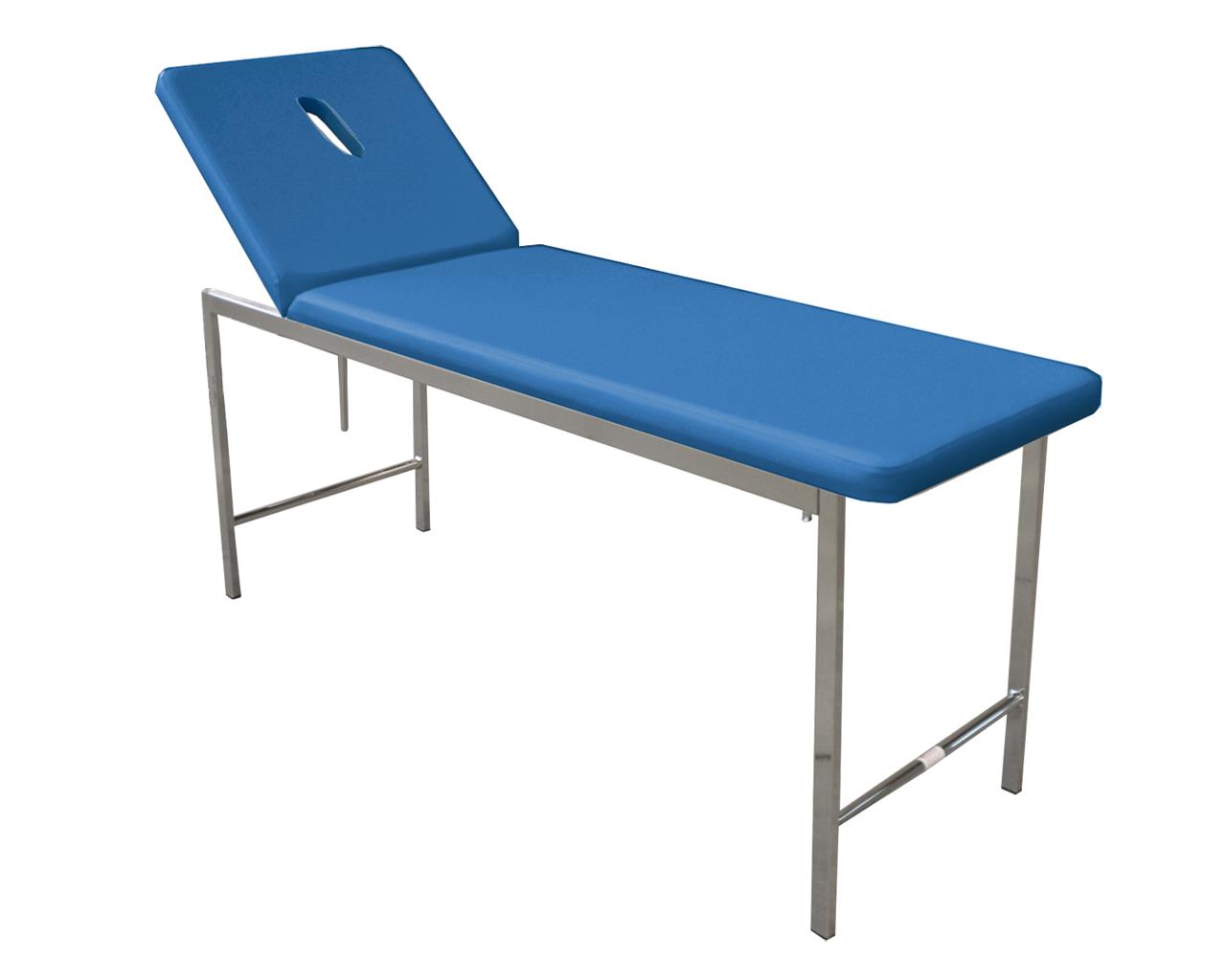 Lettino classico da visita con telaio e gambe realizzate in acciaio cromato. Dotato di schienale forato e di gambe con pedini in plastica.