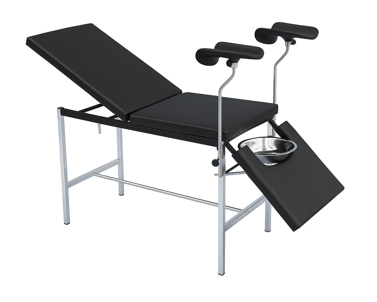 Lettino ginecologico realizzato su robusta struttura in tubo rettangolare cromato di acciaio. Schienale e reggigambe regolabili in altezza. Materassino in materiale lavabile, autoestinguente. Spedito smontato.