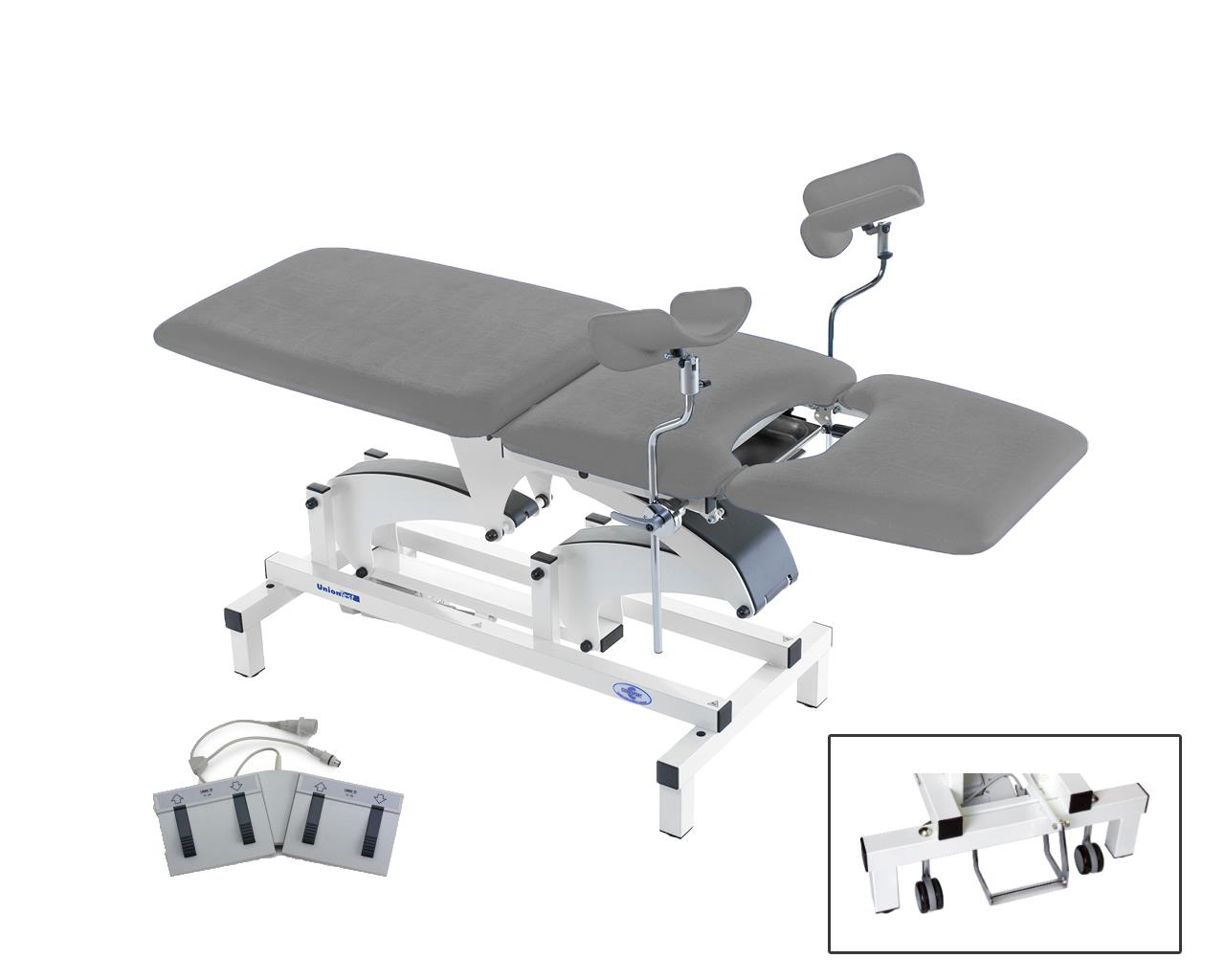 Lettino polivalente a due motori, indicato in ginecologia ed urologia per diagnosi e trattamenti. Regolabile elettricamente in altezza mediante pedaliera.