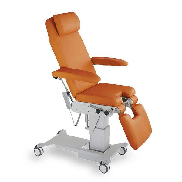 Poltrona a tre sezioni regolabile elettricamente in altezza, per terapia e visita medica, ginecologia e urologia. Pediera e schienale sono regolabili elettricamente. Il lettino è dotato di braccioli richiudibili, reggicosce regolabili in altezza e rotazione, vaschetta estraibile in acciaio inox.