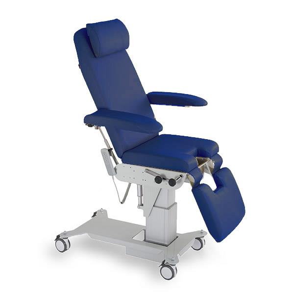 Poltrona a tre sezioni regolabile elettricamente in altezza, per terapia e visita medica, ginecologia e urologia. Pediera e schienale sono regolabili elettricamente. Il lettino è dotato di braccioli richiudibili, reggicosce regolabili in altezza e rotazione, vaschetta estraibile in acciaio inox.
