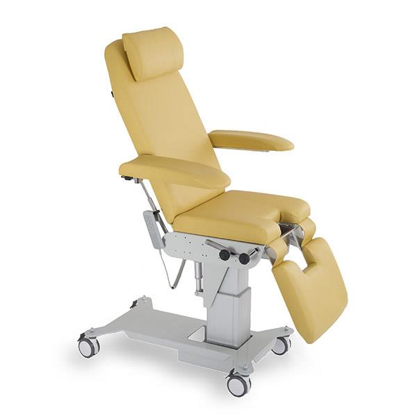 Poltrona a tre sezioni regolabile elettricamente in altezza, per terapia e visita medica, ginecologia e urologia. Pediera e schienale sono regolabili elettricamente. Il lettino è dotato di braccioli richiudibili, reggicosce regolabili in altezza e rotazione, vaschetta estraibile in acciaio inox.
