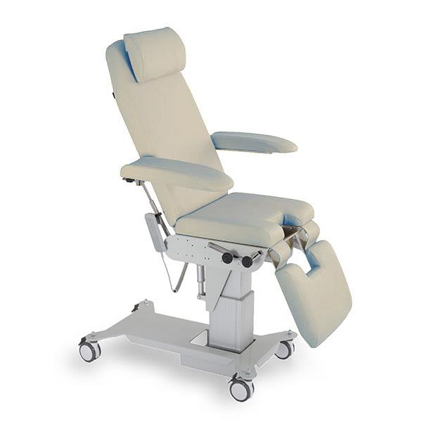Poltrona a tre sezioni regolabile elettricamente in altezza, per terapia e visita medica, ginecologia e urologia. Pediera e schienale sono regolabili elettricamente. Il lettino è dotato di braccioli richiudibili, reggicosce regolabili in altezza e rotazione, vaschetta estraibile in acciaio inox.