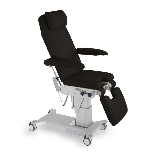 Poltrona a tre sezioni regolabile elettricamente in altezza, per terapia e visita medica, ginecologia e urologia. Pediera e schienale sono regolabili elettricamente. Il lettino è dotato di braccioli richiudibili, reggicosce regolabili in altezza e rotazione, vaschetta estraibile in acciaio inox.