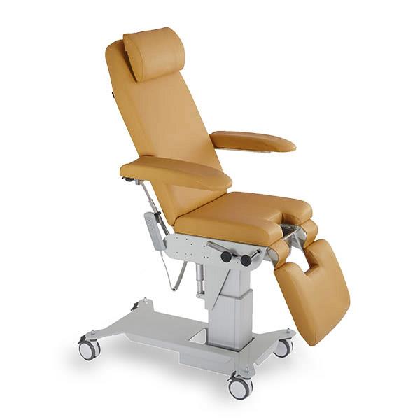 Poltrona a tre sezioni regolabile elettricamente in altezza, per terapia e visita medica, ginecologia e urologia. Pediera e schienale sono regolabili elettricamente. Il lettino è dotato di braccioli richiudibili, reggicosce regolabili in altezza e rotazione, vaschetta estraibile in acciaio inox.