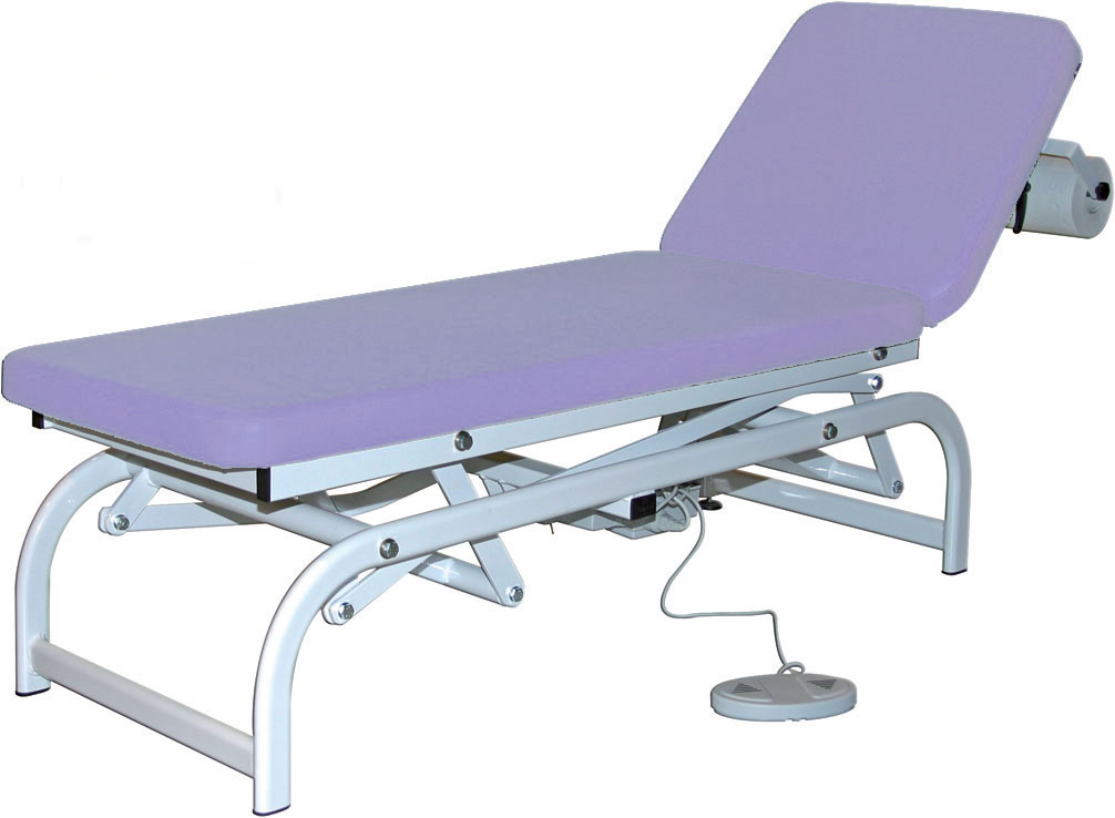 Lettino regolabile in altezza elettricamente tramite pedale, e dotato di testata facilmente regolabile mediante un sistema meccanico.