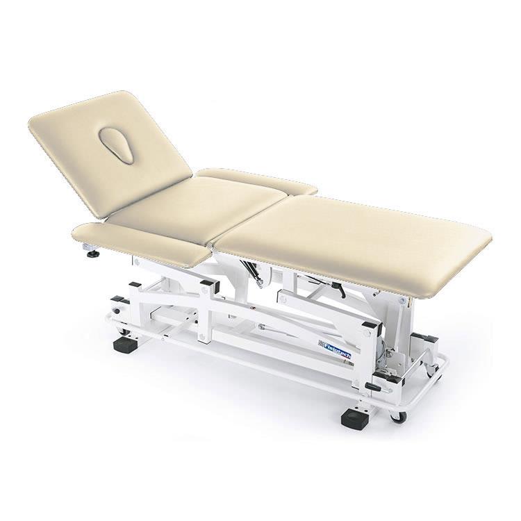Lettino a tre sezioni regolabile elettricamente in altezza con comando a pedale 24 V, per trattamenti, rieducazione posturale e massaggi.