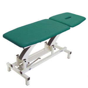 Lettino da visita e trattamenti. Regolabile elettricamente in altezza mediante pedaliera a bassa tensione (24 V). Letto dotato di una sezione mobile, sezione testa (con foro per bocca-naso) regolabile attraverso ammortizzatore a gas e sezione gambe fissa.