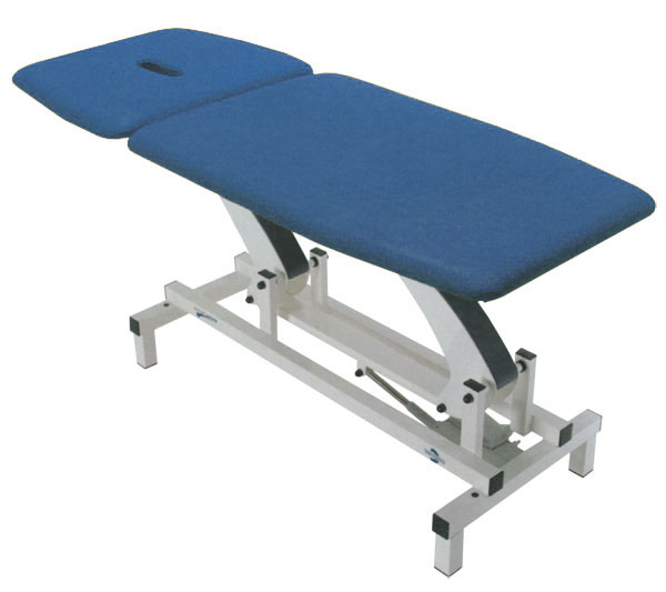 Lettino per visite e terapia ad alta stabilità. Regolazione elettrica dell’altezza mediante pedaliera (bassa tensione 24 V). Una sezione mobile, sistema di regolazione della testata (con foro naso-bocca) servoassistito da molla a gas e sezione gambe fissa. L’ampia testata può essere regolata in positivo ed in negativo.