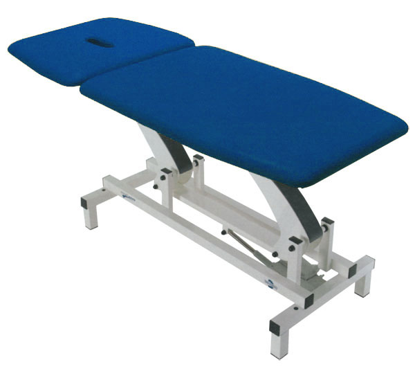 Lettino per visite e terapia ad alta stabilità. Regolazione elettrica dell’altezza mediante pedaliera (bassa tensione 24 V). Una sezione mobile, sistema di regolazione della testata (con foro naso-bocca) servoassistito da molla a gas e sezione gambe fissa. L’ampia testata può essere regolata in positivo ed in negativo.