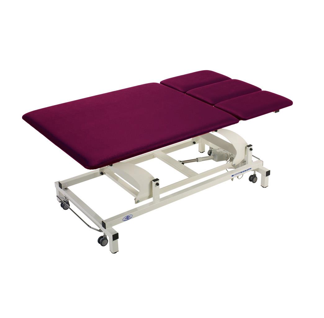 Lettino Bobath per trattamenti riabilitativi, progettato per essere utilizzato con la metodologia R.I.C. Regolabile elttricamente in altezza mediante barra perimetrale a bassa tensione (24V). Larghezza complessiva di 120 cm con testata regolabile in positivo nella parte centrale fino a 90°, servo-assistita da molla a gas.