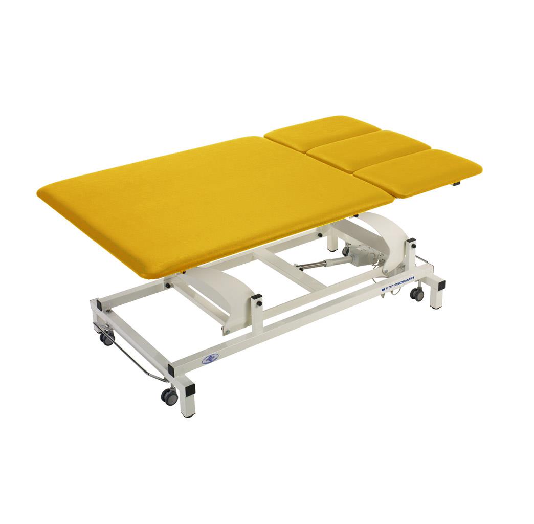 Lettino Bobath per trattamenti riabilitativi, progettato per essere utilizzato con la metodologia R.I.C. Regolabile elttricamente in altezza mediante barra perimetrale a bassa tensione (24V). Larghezza complessiva di 120 cm con testata regolabile in positivo nella parte centrale fino a 90°, servo-assistita da molla a gas.