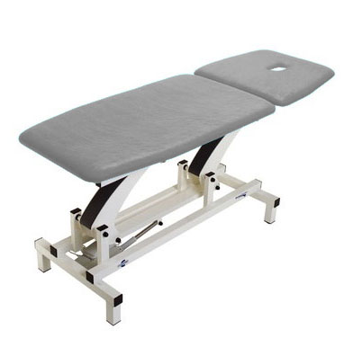 Regolazione idraulica dell’altezza mediante pedaliera (bassa tensione 24 V). Una sezione mobile, sistema di regolazione della testata (con foro naso-bocca) servoassistito da molla a gas e sezione gambe fissa. L’ampia testata può essere regolata in positivo ed in negativo. Capacità di sollevamento 200 kg. Produzione Italiana.