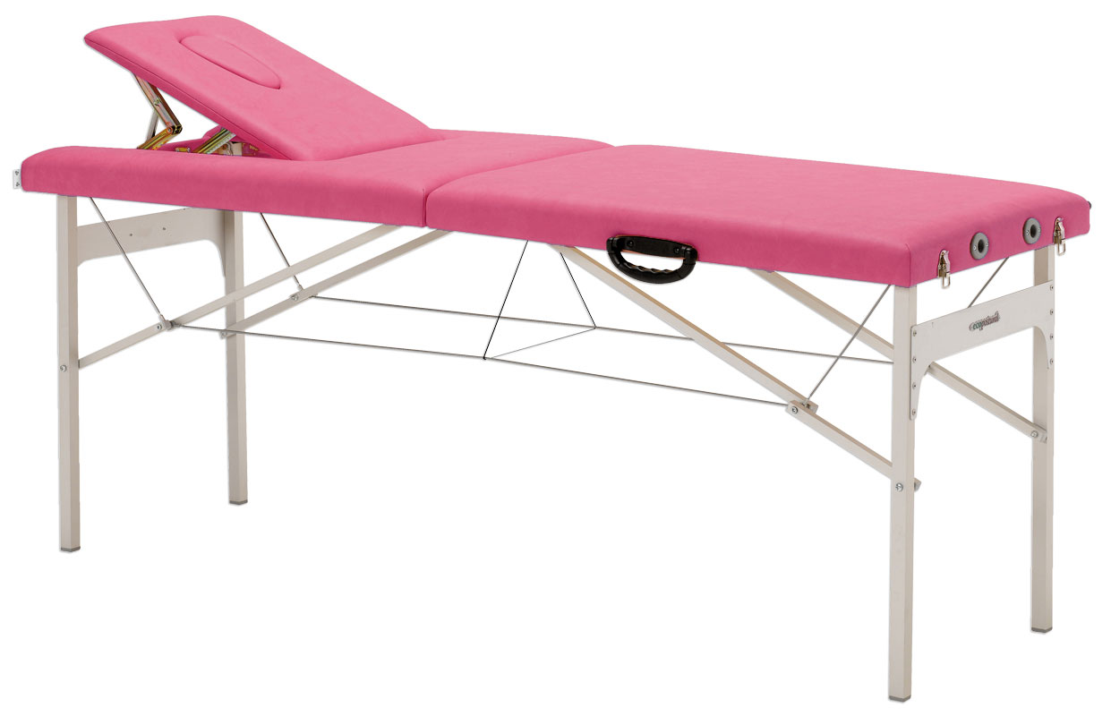 Leggero pieghevole a valigia con struttura in alluminio a due sezioni. Testata predisposta di foro naso-bocca con sezione mobile fino a 30° e fori poggiatesta.