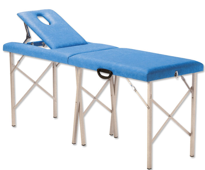 Leggero, ripiegabile, in 2 sezioni, lettino a valigia con telaio in alluminio. Gambe centrali doppie per una sicurezza migliorata e sistema di bloccaggio sui cardini. Appoggia testa con foro per bocca/naso. Rivestimento in finta pelle. Prodotto in Italia.