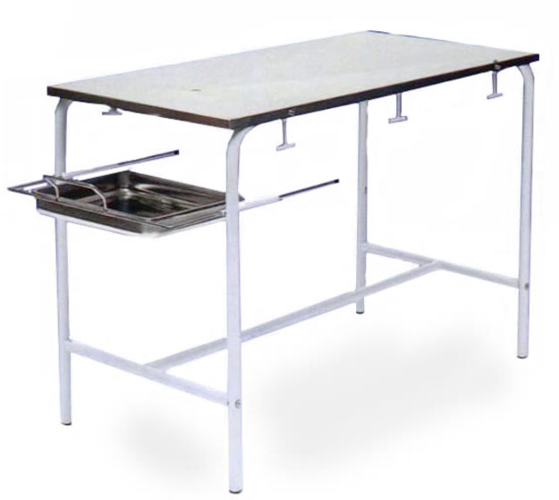 Tavolo da visita per veterinaria con struttura in acciaio verniciato, piano in acciaio inox AISI 304 15/10 con foro e bacinella raccogli liquidi sul lato inferiore. Ganci laterali per immobilizzare gli animali.