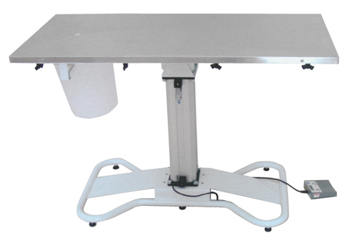 Tavolo operatorio per veterinaria con sollevamento elettrico (82/102 cm), struttura in acciaio verniciato a forno e piano in acciaio inox AIsI 304 (120×56 cm) con foro e bacinella raccogli liquidi sul lato inferiore. Trendelenburg 15° e antitrendelenburg fino a 15°. Gancio laterale per immobilizzare gli animali.