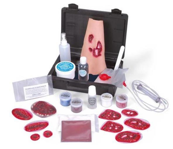 Set economico per la simulazione di ferite. Ferite utilizzabili e accessori ricaricabili consentono di esercitare diverse tecniche di fasciatura e di applicazione di stecche. Il set per simulazion edi ferite viene consegnato in valigetta.