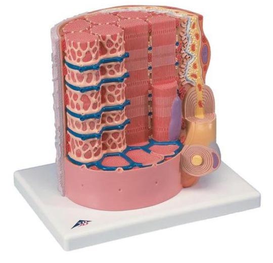 Questo modello presenta la sezione di una fibra del muscolo striato con placca motrice ingrandita ca. 10.000 volte. La fibra muscolare rappresenta l'elemento basilare del muscolo striato trasversalmente.