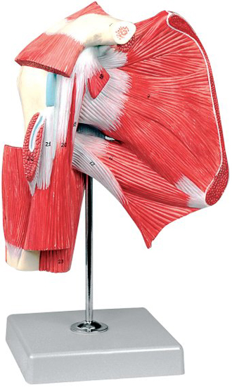 Modellino anatomico della spalla, con muscolatura profonda. Questo modellino illustra con un livello di dettaglio superlativo i muscoli oltre ai legamenti e alla struttura ossea della spalla. Attraverso le differenti sezioni è possibile osservare gli strati muscolari più profondi fino alla struttura ossea.