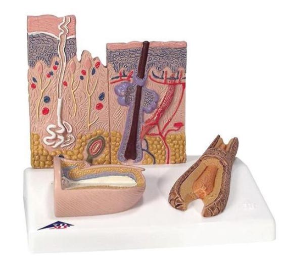 Inoltre un altro modello mostra una sezione dell’unghia con lamina, letto e radice dell’unghia. La rappresentazione di una radice di pelo con tutti i suoi strati cellulari completa il modello.