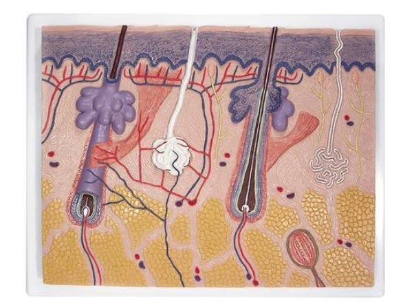 Modello in rilievo su base, che mostra una sezione dei tre strati della pelle con peli, ingrandita 70 volte.