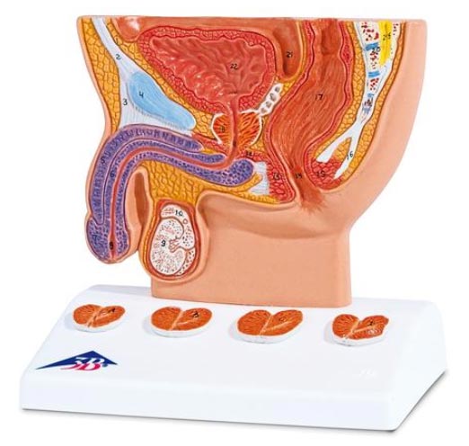 Questa sezione della parte inferiore del corpo maschile mostra una prostata sana con vescica, uretra, pene, testicoli, sinfisi e intestino crasso. Il restringimento dell’uretra causato dalla prostata malata viene evidenziato con 4 sezioni trasversali. Tutte le strutture anatomiche sono dipinte a mano con fedeltà sin nei dettagli.